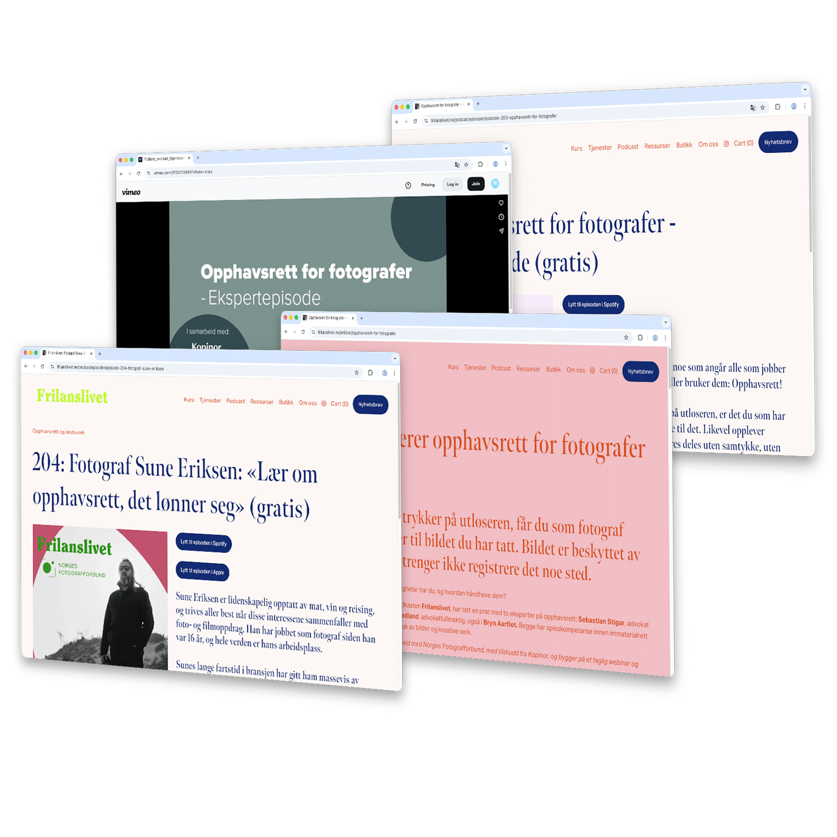 Vi har laget tre podkastepisoder som belyser opphavsrett fra ulike perspektiver. Her møter du fotografer, advokater og eksperter som deler sine erfaringer og råd.